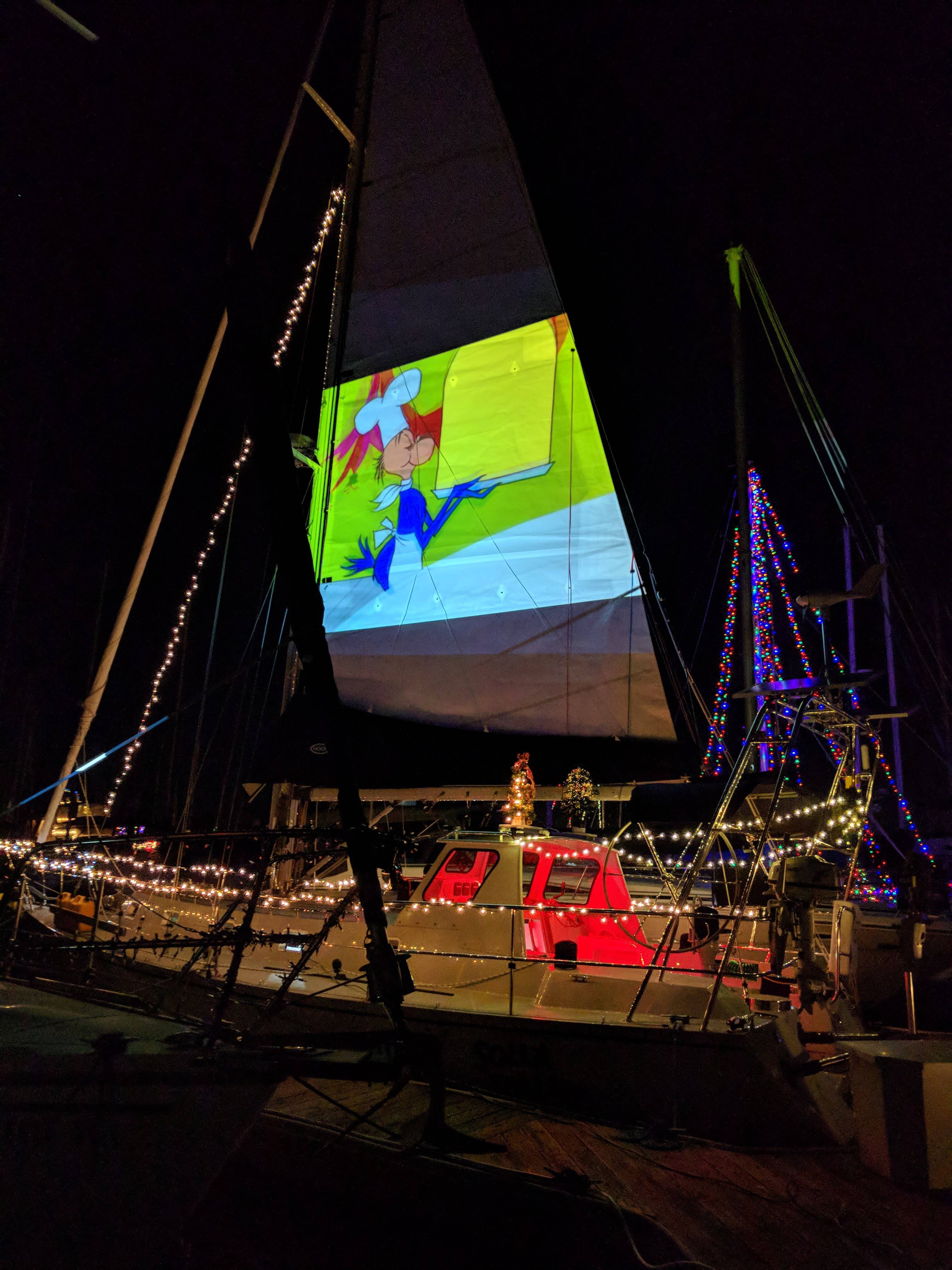 The main burned in the fire so we had a new one made (Hood Sails). It wasn’t installed until sometime in December. The genoa miraculously survived the fire (though we had a sailmaker carefully look it over). Given the Holidays, we didn’t have time to do a shakedown cruise. In fact the first use of our new main was as the projector screen for “How the Grinch Stole Christmas” at the marina holiday party! On New Years Eve, Solla finally stretched her legs. It may have been a gloomy day but Harry and I were THRILLED at how everything performed that weekend. After the YEARS of work, sweat, blood (literally), and tears (literally), Solla Sollew sailed.